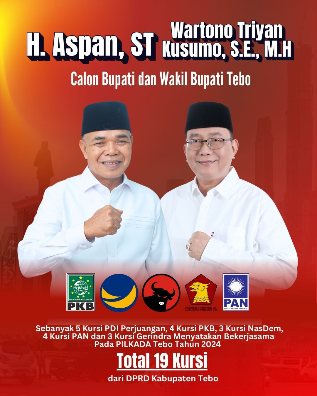 Sebagai mana yang disampaikan oleh andre rosiade pada saat penyerahan dokumen rekomendasi dukungan untuk maju pilkada beberapa waktu lalu " menghimbau warga kabupaten Tebo untuk memilih pasangan Aspan dan Wartono pada saat pencoblosan nanti"
